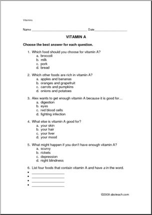 Vitamins Worksheets for Students - Provide educational worksheets to help students understand the importance and benefits of various vitamins for their health.