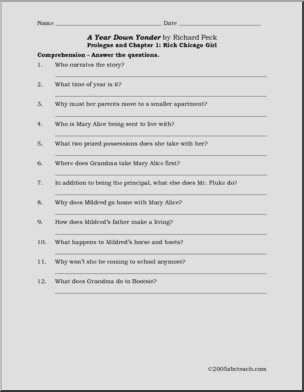 Use this ‘Book: A Year Down Yonder (upper elem/ middle)’ printable worksheet in the classroom or at home. Your students will love this ‘Book: A Year Down Yonder (upper elem/ middle)’. Chapter-by-chapter comprehension, vocabulary, and writing questions to accompany Richard Peck’s Newbery-winning (2000) novel about a Chicago girl who spends a year of the Depression […]