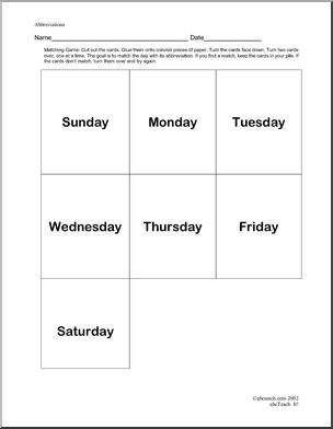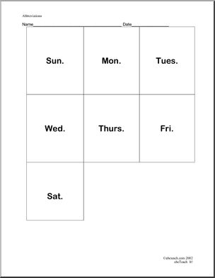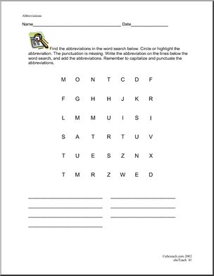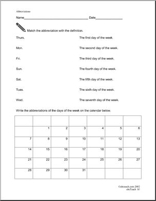 Use this ‘Learning Center: Abbreviations 2’ printable worksheet in the classroom or at home. Your students will love this ‘Learning Center: Abbreviations 2’. Days of the week. Poster and four activities.