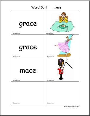 Use this ‘Word Sort Center: -ace Words’ printable worksheet in the classroom or at home. Your students will love this ‘Word Sort Center: -ace Words’. Cards with words and matching pictures for words ending in -ace; these can be used in matching games and word sort center activities