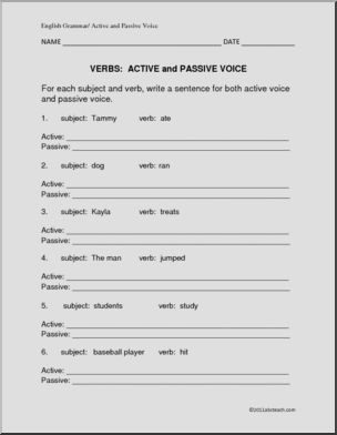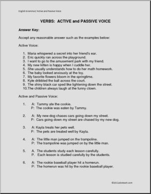 Use this ‘Grammar: Active & Passive Voice (elem)’ printable worksheet in the classroom or at home. Your students will love this ‘Grammar: Active & Passive Voice (elem)’. One page explanation with examples each for active and passive voice; and one page for each of practice.