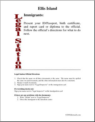 Learning about Ellis Island? Bring the lesson to life with this activity, in which students play immigrants, interpreters, examiners, etc. Signs for the various stations (medical, etc.); instructions for examiners, and “documents” for immigrants to carry are all included.