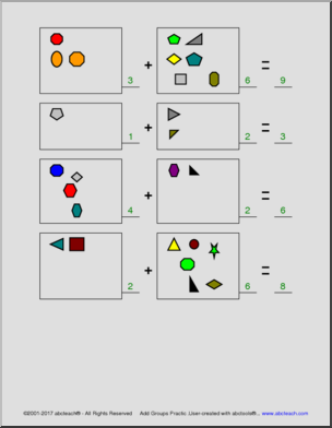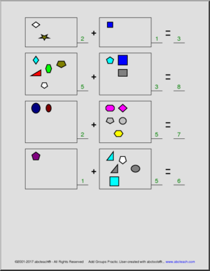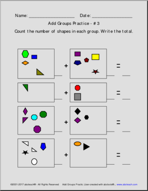 10 pages of practice – Count the number of shapes in each group and write the total. Created with our abctools Math Worksheet Generator. CC:K.OA.A.2