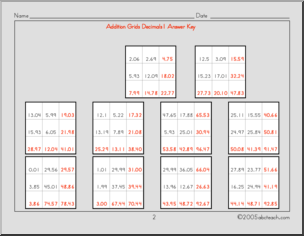 This Addition Grids – Decimals 1 Worksheet is perfect to practice addition skills. Your elementary grade students will love this Addition Grids – Decimals 1 Worksheet. Add numbers (with decimals to the hundredths place) vertically and horizontally to complete ten nine-square grids. Common Core: 6.NS.3