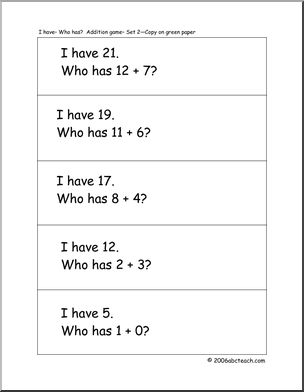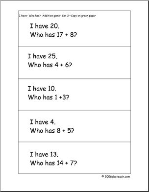 This Addition (set 2) Math Game is perfect to practice addition skills. Your elementary grade students will love this Addition (set 2) Math Game. “I have… Who has?” with addition up to 25.