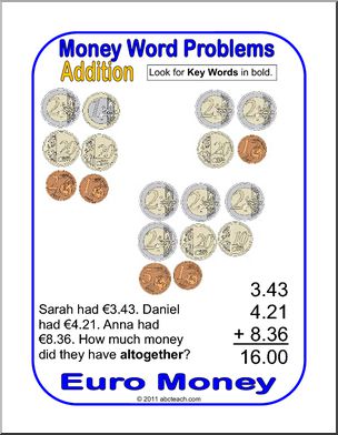This Addition with Euro Coins (color) (upper elem/middle) Euro Math Posters is perfect to practice money skills. Your elementary grade students will love this Addition with Euro Coins (color) (upper elem/middle) Euro Math Posters. A set of three color illustrated posters of addition story problems related to Euro coins.