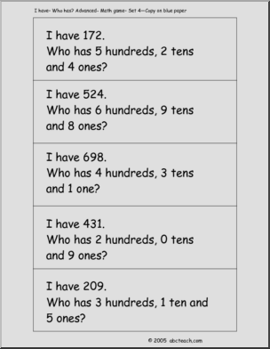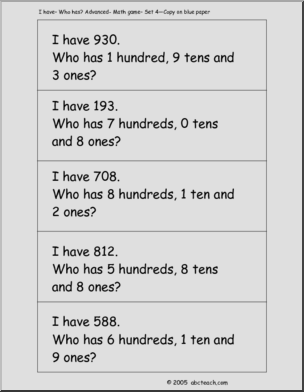 This Advanced Place Value (set 1) Math Game is perfect to practice place value skills. Your elementary grade students will love this Advanced Place Value (set 1) Math Game. “I have – Who has?” Practice the numbers 1-999 with this place value game. Includes hundreds place and numbers up to 999.