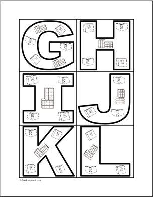 The letters of the alphabet, presented in black outline, filled with outlines of books. Six letters to a page. Great for bulletin boards, desk decorations, and more.