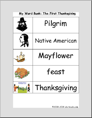 The letters of the alphabet, presented in black outline, filled with colorful Mayflowers, turkeys, and cornucopias. Four letters to a page. Great for bulletin boards, desk decorations, and more.