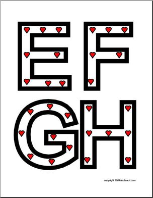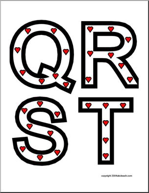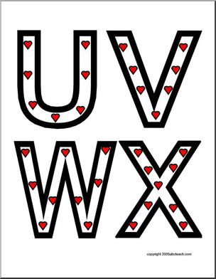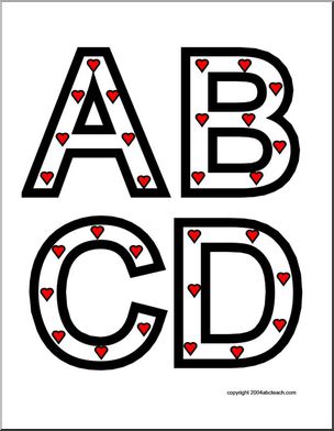 The uppercase letters of the alphabet, presented in black outline, filled with small hearts. Four letters to a page. Great for bulletin boards, desk decorations, and more.