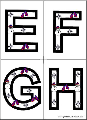 The letters of the alphabet, presented in black outline, filled with colorful snowmen and snowflakes. Four letters to a page. Great for bulletin boards, desk decorations, and more.