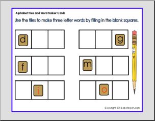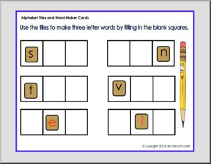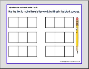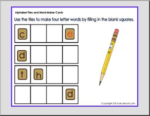 This set includes alphabetical tiles, letter boards for 3,4, and 5 letter words. Laminate for longer use. Great hands-on spelling activity.