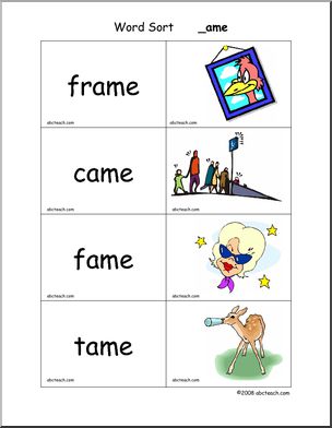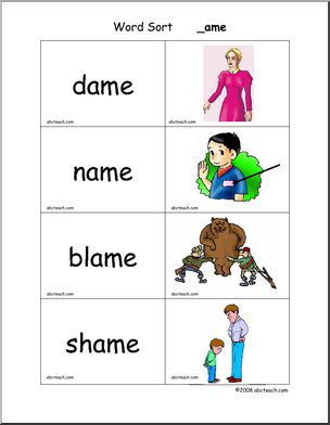 Use this ‘Word Sort Center: -ame Words’ printable worksheet in the classroom or at home. Your students will love this ‘Word Sort Center: -ame Words’. Cards with words and matching pictures for words ending in -ame; these can be used in matching games and word sort center activities.