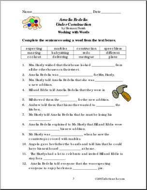 Use this ‘Book: Amelia Bedelia Under Construction’ printable worksheet in the classroom or at home. Your students will love this ‘Book: Amelia Bedelia Under Construction’. Word unscramble, word search, crossword puzzle, cloze exercise, and short answer comprehension questions review Herman Parish’s story of a construction project full of funny misunderstandings.