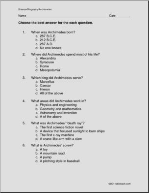 Use this ‘Biography: Archimedes of Syracuse (elem/upper elem)’ printable worksheet in the classroom or at home. Your students will love this ‘Biography: Archimedes of Syracuse (elem/upper elem)’. A two page biography of the Greek mathematician and scientist, Archimedes. Includes multiple choice and short answer question sets.