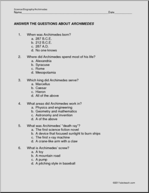 Use this ‘Biography: Archimedes of Syracuse (upper elem/middle)’ printable worksheet in the classroom or at home. Your students will love this ‘Biography: Archimedes of Syracuse (upper elem/middle)’. A two page biography of the Greek mathematician and scientist, Archimedes. Includes a set of short answer and a set of multiple choice questions, as well as a […]