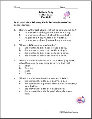 Use this ‘Book: Arthur’s Baby (elementary)’ printable worksheet in the classroom or at home. Your students will love this ‘Book: Arthur’s Baby (elementary)’. Book comprehension and vocabulary enhancement for this installment of Marc Brown’s popular “Arthur” series. Arthur has a new baby sister.