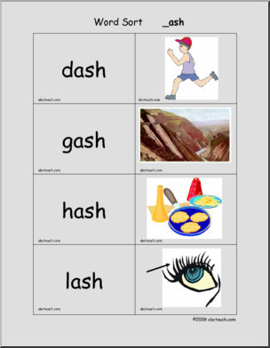 Use this ‘Word Sort Center: -ash Words’ printable worksheet in the classroom or at home. Your students will love this ‘Word Sort Center: -ash Words’. Cards with words and matching pictures for words ending in -ash; these can be used in matching games and word sort center activities.