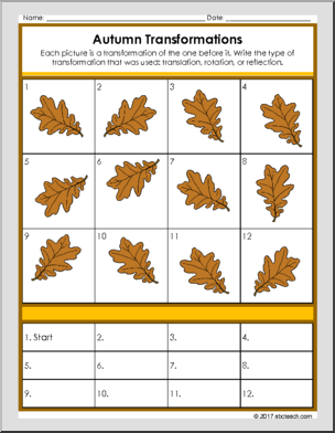 Five fun math activities with an Autumn theme: 1. Find the value of each picture, 2. If/then wacky addition, 3. Find the number that doesn’t belong, 4. Geometry transformations, 5. Mystery Picture.