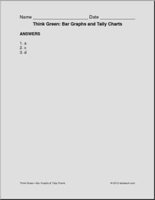 Three pages of bar graphs on Think Green topics. Students identify the tally chart that correctly reflects each graph. Answer sheet.