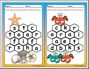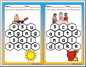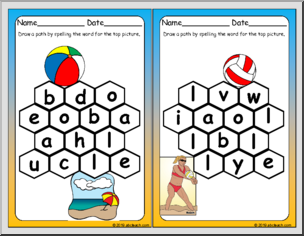 Practice spelling with these fun Beach-themed puzzles. Draw a path from one picture to the other by spelling the word for the top picture. Use each letter only once, and only use letters that touch. Word List: beach, seashells, sunglasses, sandcastle, beachball, volleyball, surfboard, sea turtle, starfish, crab. Laminate to make reusable puzzles.