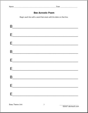 Use this ‘Poetry: Bees (elem/upper elem)’ printable worksheet in the classroom or at home. Your students will love this ‘Poetry: Bees (elem/upper elem)’. An introduction to some basic poetic structures, including alliteration, similes, and acrostics, using bee themes. Includes border paper for final drafts.