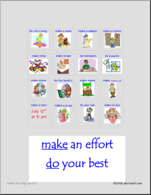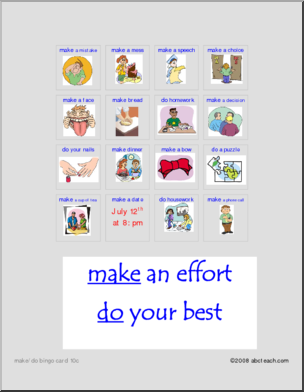 ìMakeî versus ìDoî–Use this bingo game for auditory and visual reinforcement of English expressions using ìmakeî and ìdoî.