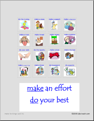 ìMakeî versus ìDoî–Use this bingo game for auditory and visual reinforcement of English expressions using ìmakeî and ìdoî.