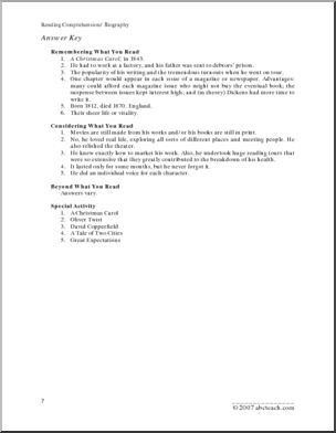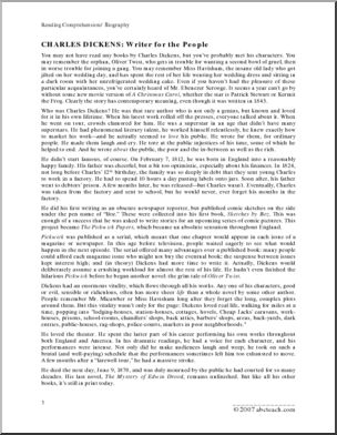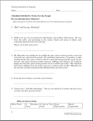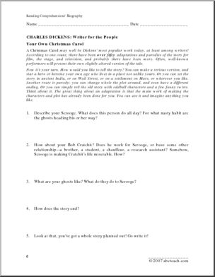 A reading comprehension biography about Dickens, followed by activities like “Write Your Own Christmas Carol” and “Match the Quote to the Book” and more.