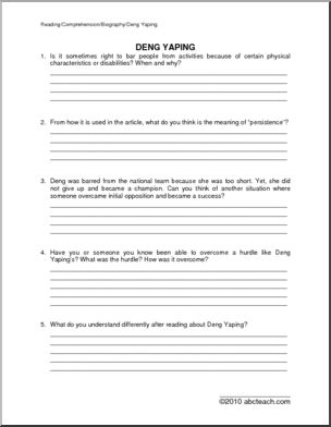 A two page biography of Chinese table tennis champion, Deng Yaping, who overcame a physical challenge to be the most respected table tennis player in history. Multiple choice and short answer questions.