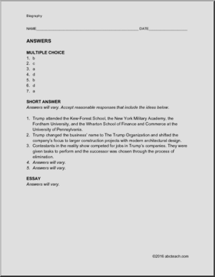 Updated: A one page biography of Donald Trump with multiple choice and short answer questions and one long essay question.