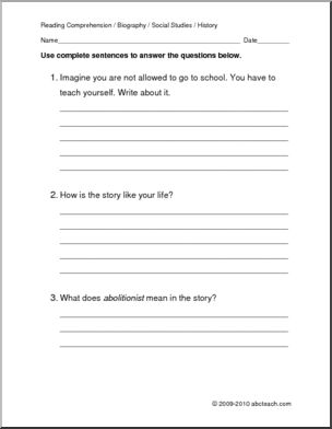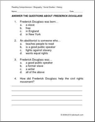 An informative page about this famous abolitionist is followed by 3 multiple choice questions, 1 short response question, and 3 short answer essay questions.