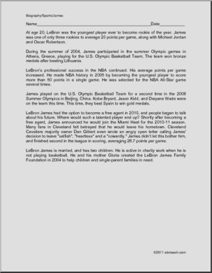 A two page biography of U.S. Olympic and NBA athlete LeBron James, with a set of multiple choice, a set of short answer questions, and a writing prompt.