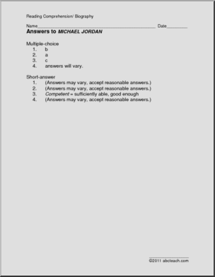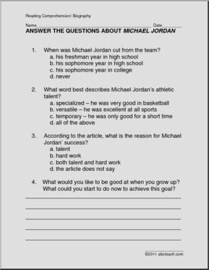 Biography of the basketball star, followed by 3 multiple choice questions and 5 questions that require brief written responses.
