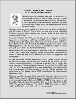 Under the pseudonym “Mark Twain” Samuel Clemens produced some of the first and best American novels. Learn more about the writer and the man with this reading comprehension.
