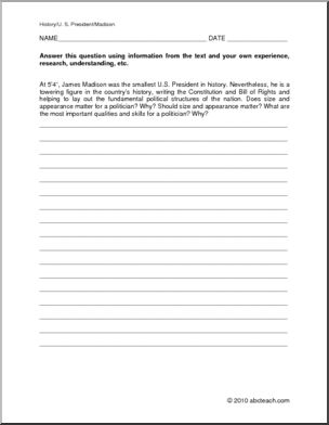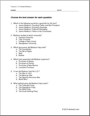 A one page reading comp of President James Madison, with comprehension and short answer questions and one essay question.