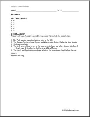 A one page biography of President James Polk with comprehension and short answer questions and one long essay question.
