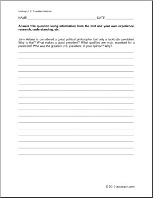 A one page reading comprehension on the life of U. S. President John Adams, with multiple choice and short response questions and one essay question.