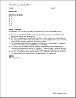 A one page biography of Richard Nixon with multiple choice and short essay questions and a long essay question.