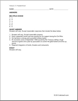A one page biography of President Ulysses S. Grant with multiple choice, short answer essay,and a long answer essay question.