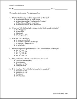 A one page biography of William Taft, with multiple choice and short essay questions and a long essay questions.