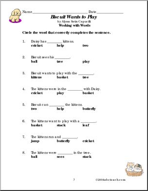 Use this ‘Book: Biscuit Wants to Play (primary)’ printable worksheet in the classroom or at home. Your students will love this ‘Book: Biscuit Wants to Play (primary)’. Book comprehension and vocabulary enhancement for this installment of Alyssa Satin Capucilli’s popular “Biscuit” series. The puppy Biscuit makes friends with two kittens.
