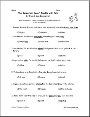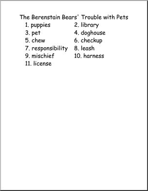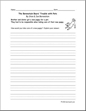 A six page book unit of comprehension questions, write and draw activities and word puzzles to use with “The Berenstain Bears’ Trouble with Pets.”