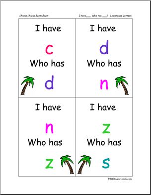 Complete set of our “Chicka Chicka Boom Boom” activities: Worksheet for spelling your name, game for matching upper and lowercase letters, and two “I have… Who has?” sets with colorful coconut tree illustrations.