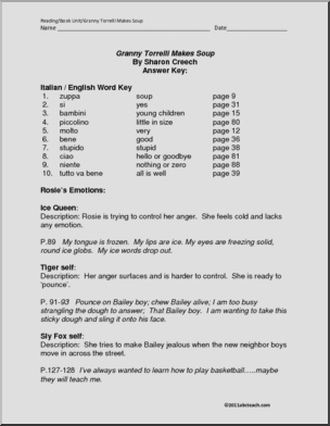 A seven page study unit for Sharon Creech’s novel, Granny Torrelli Makes Soup, with discussion and activity suggestions, writing prompts, characterization activity, an Italian translation exercise.