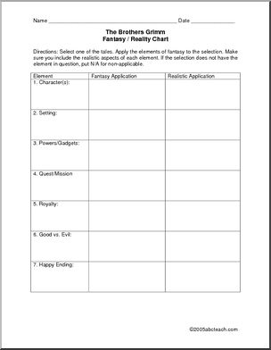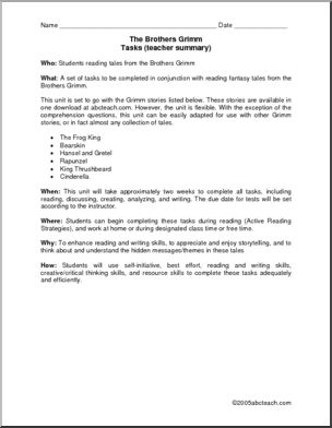 This unit takes a different approach to Grimm. Starting with a straight reading of six stories (available in one download on abcteach), the unit then addresses deeper meanings (What does Cinderella’s shoe symbolize?), and finishes with a humorous approach (what would a social worker say about Hansel and Gretel?)