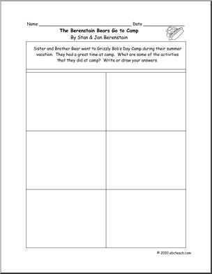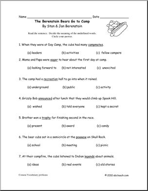 Twelve page book unit on The Berenstain Bears Go to Camp with context vocabulary, T/F and completion comprehension questions, with crossword, word search and word unscramble puzzles.