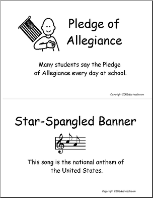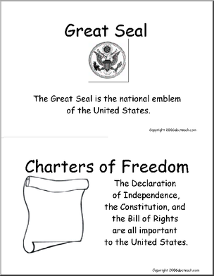 A simple 10 page booklet, each page featuring a picture of a different U.S. symbol with a short sentence (“The bald eagle is the national bird of the United States.”)