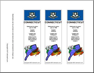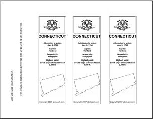 Three bookmarks, each featuring the date of admission to the union, capital, largest city, highest point, and blackline graphics showing the state flag and the state. These bookmarks are a great study aid