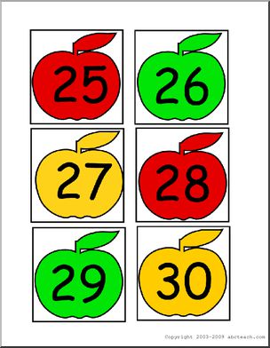 Cards with colorful apple illustrations, numbered 1-31, plus unnumbered extras. Use for calendars, games, and more!